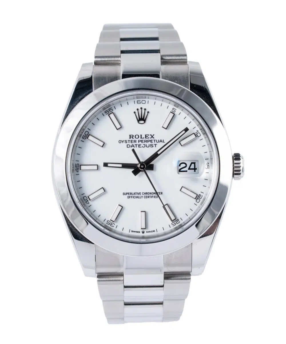 This Rolex Datejust 126300 has a White dial and a Bracelet strap.