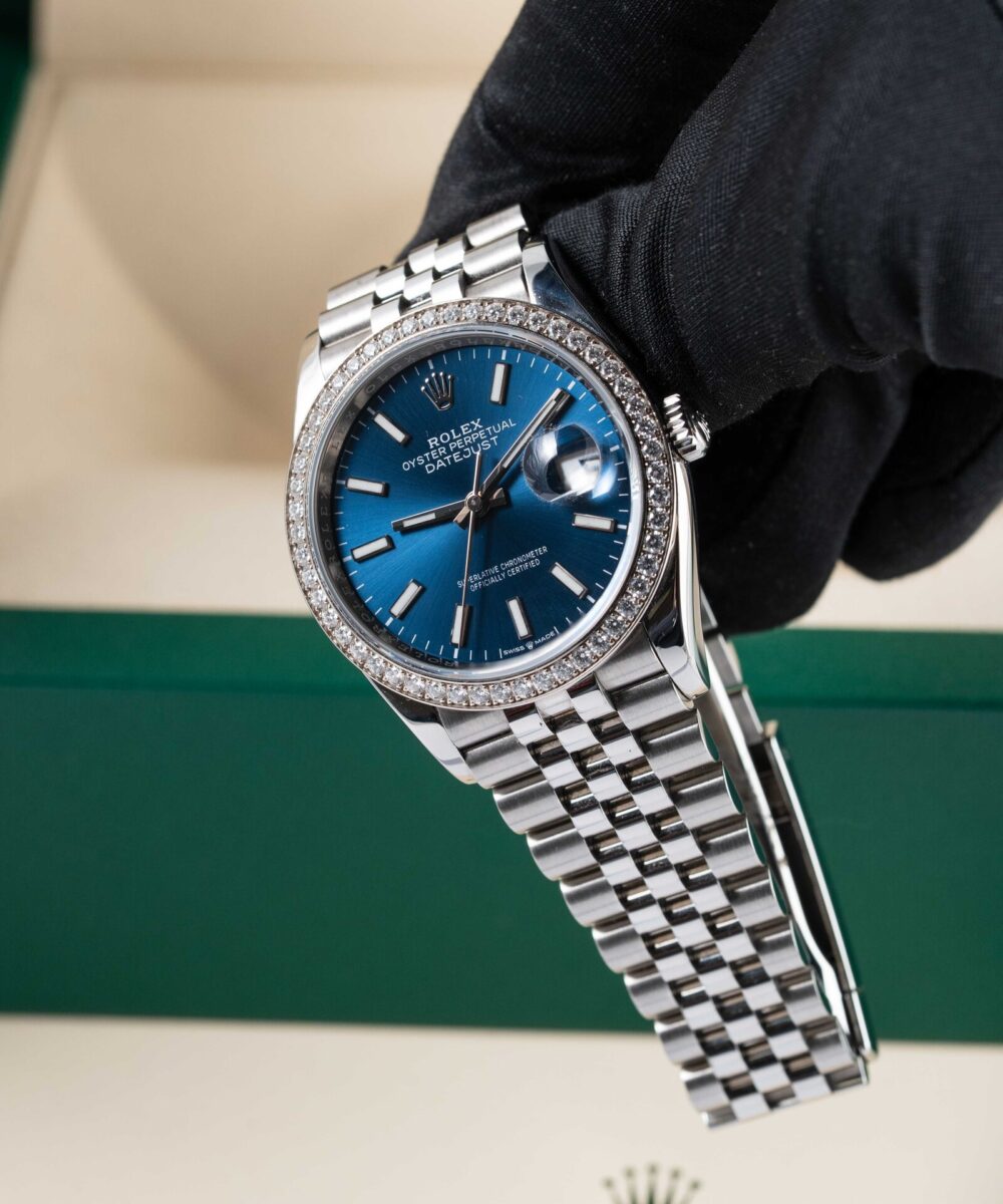 This Rolex Datejust 126284RBR has a Blue dial and a Bracelet strap.