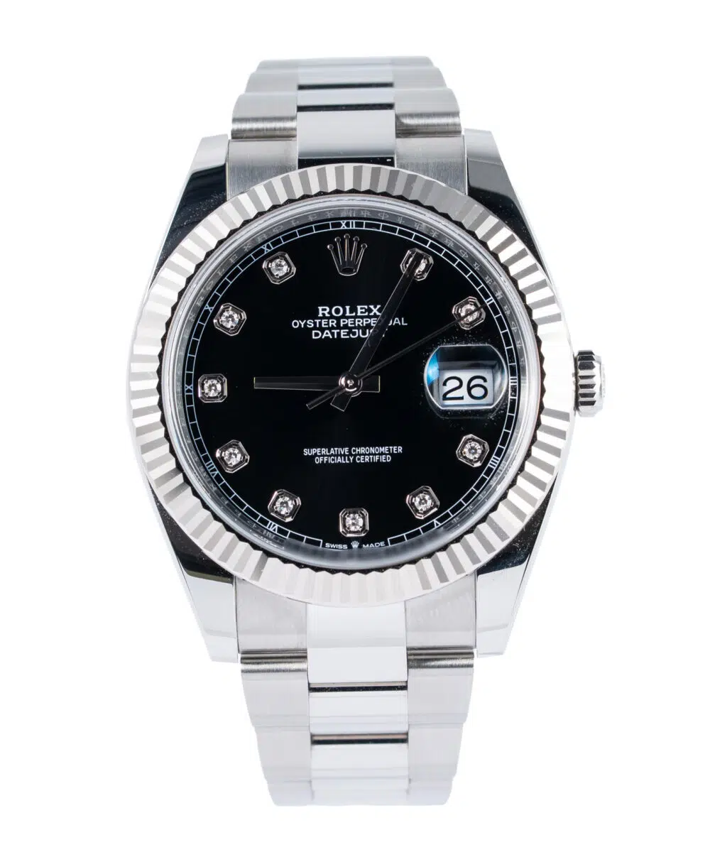 This Rolex Datejust 126334 has a Black dial and a Bracelet strap.