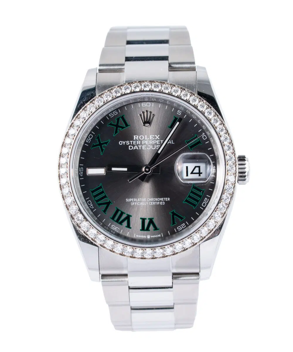 This Rolex Datejust 126284RBR has a Grey dial and a Bracelet strap.