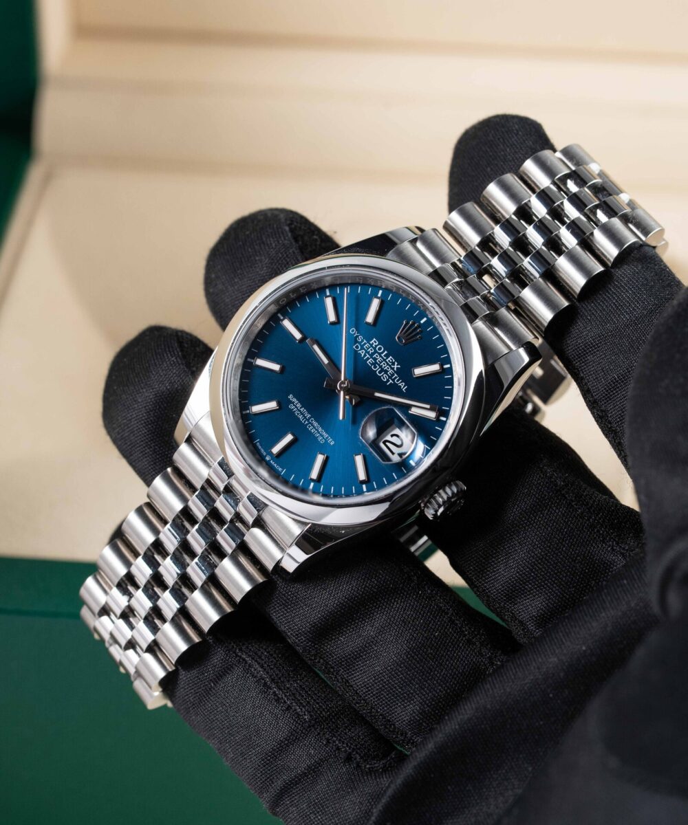 This Rolex Datejust 126200 has a Blue dial and a Bracelet strap.