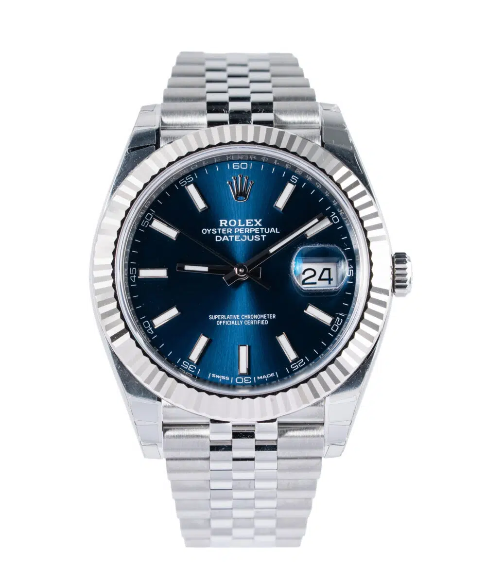 This Rolex Datejust 126334 has a Blue dial and a Bracelet strap.
