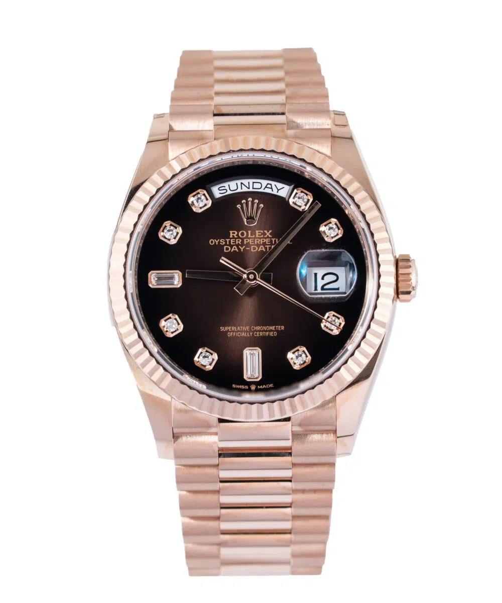 This Rolex Day-Date 128235 has a Brown Ombre dial and a Bracelet strap.