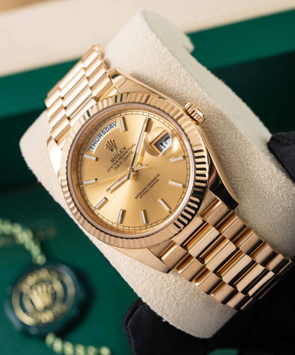 This Rolex Day-Date 228238 has a Champagne dial and a Bracelet strap.