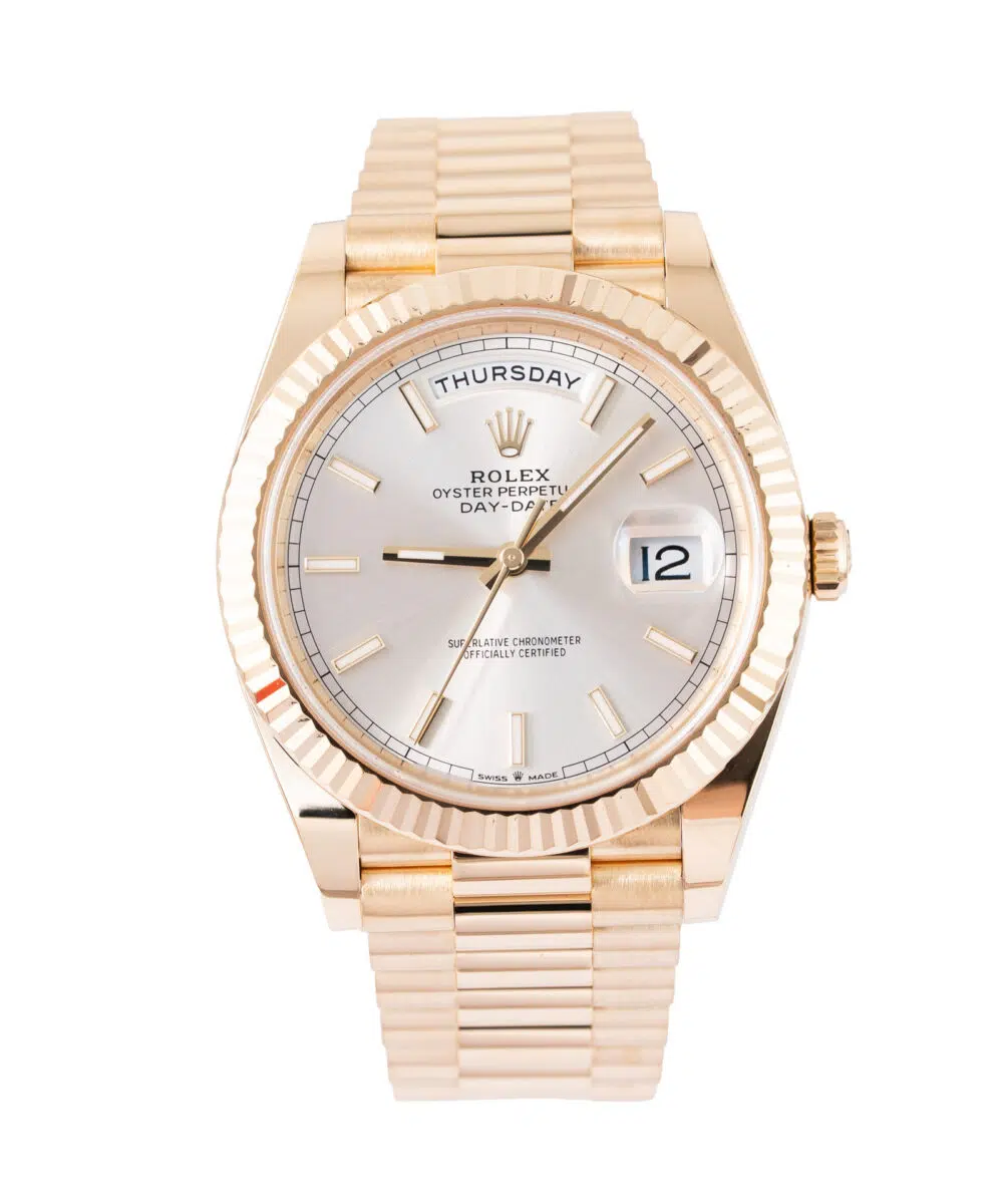 This Rolex Day-Date 228238 has a Silver dial and a Bracelet strap.