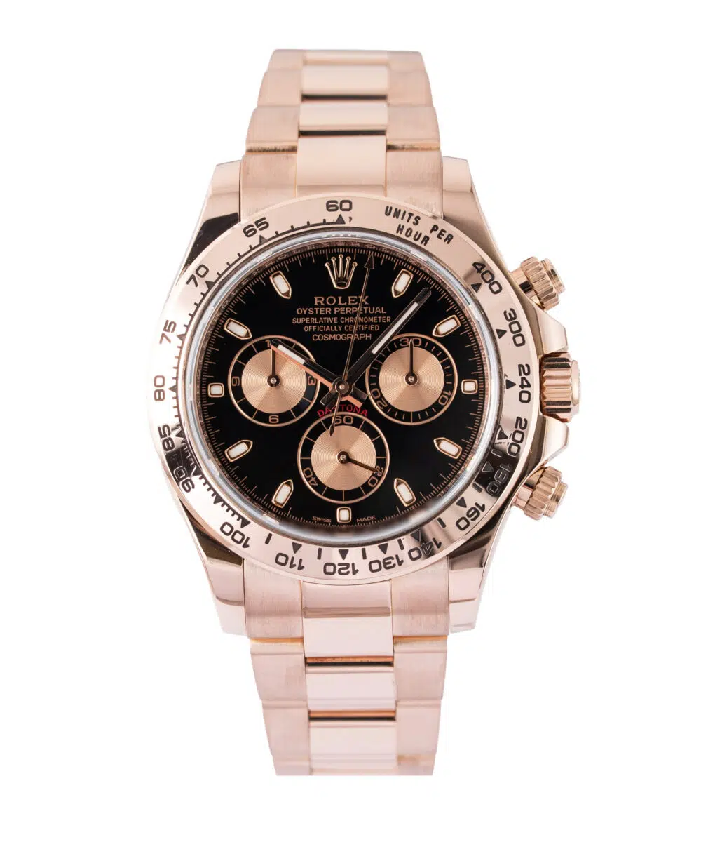 This Rolex Daytona 116505 has a Black dial and a Bracelet strap.