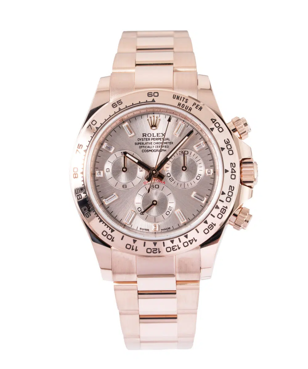This Rolex Daytona 116505 has a Pink dial and a Bracelet strap.