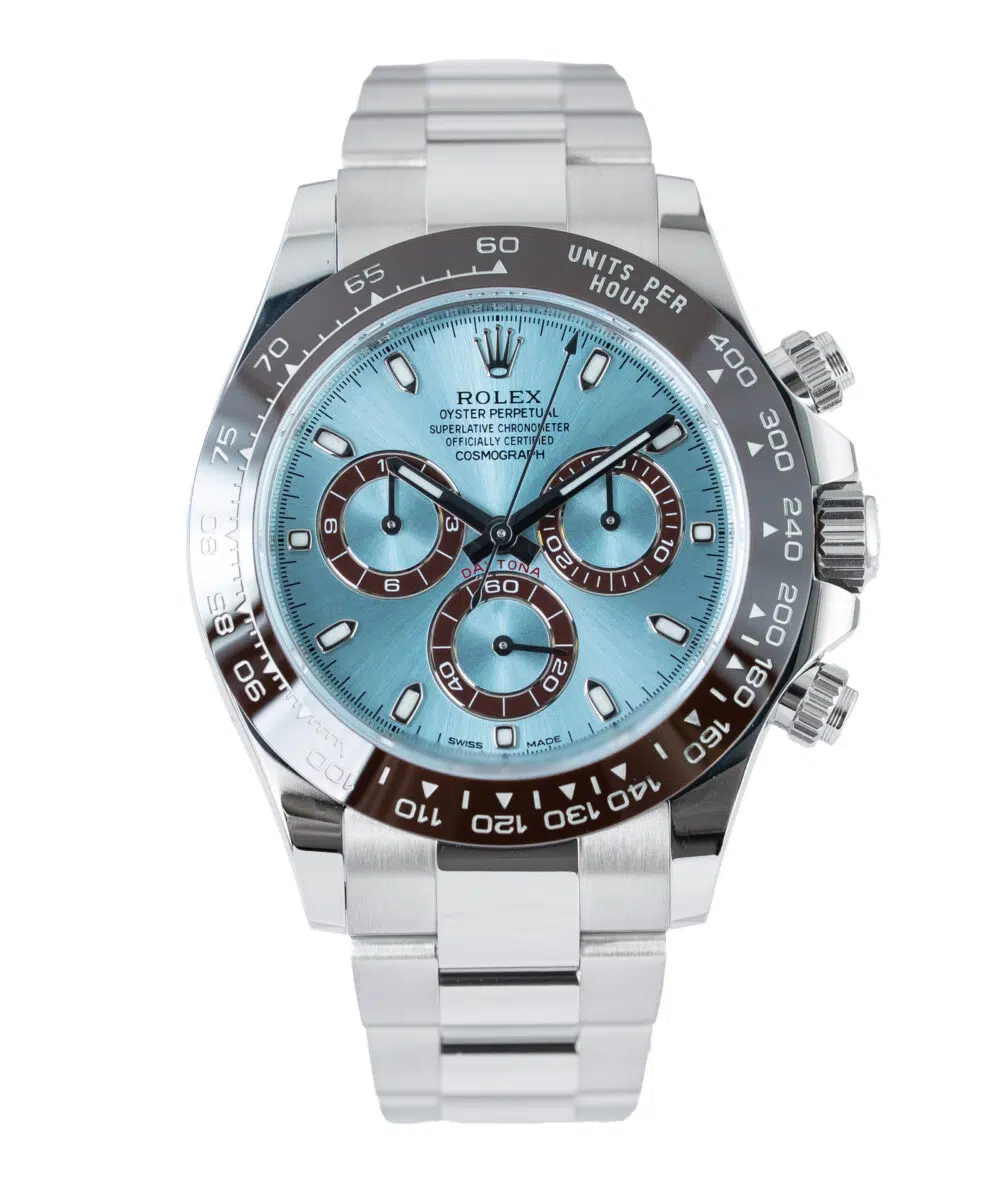 This Rolex Daytona 116506 has a Blue dial and a Bracelet strap.