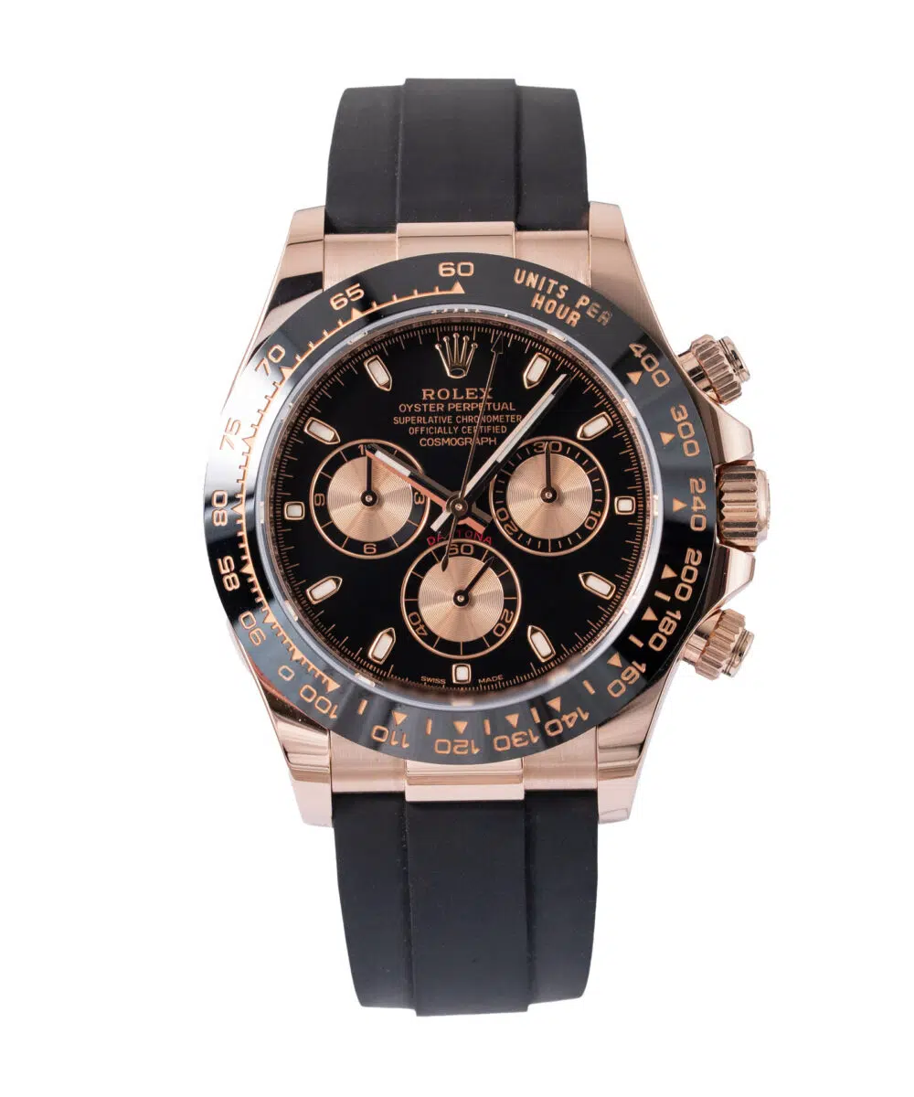 This Rolex Daytona 116515LN has a Black dial and a Rubber strap.