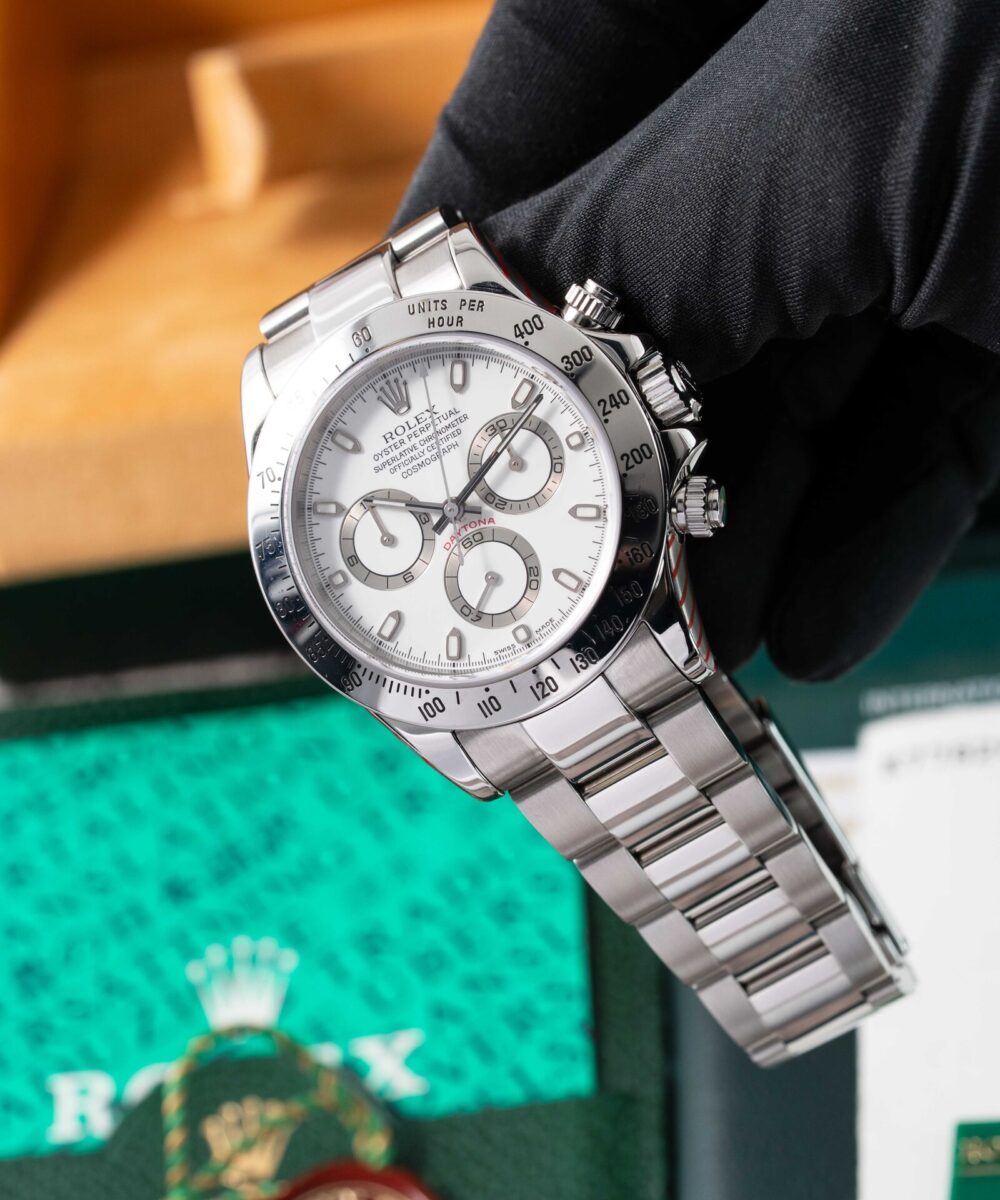 This Rolex Daytona 116520 has a White dial and a Bracelet strap.