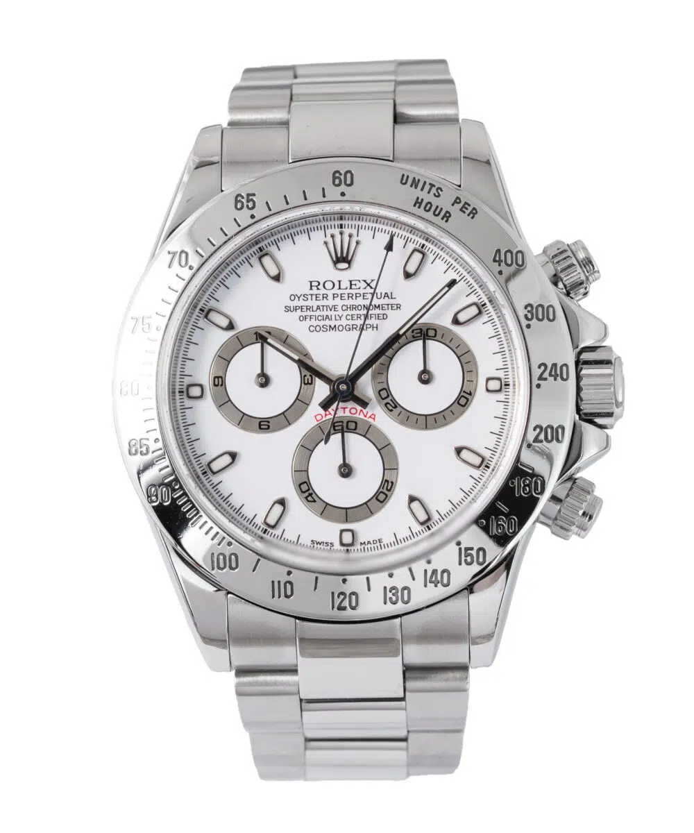 This Rolex Daytona 116520 has a White dial and a Bracelet strap.