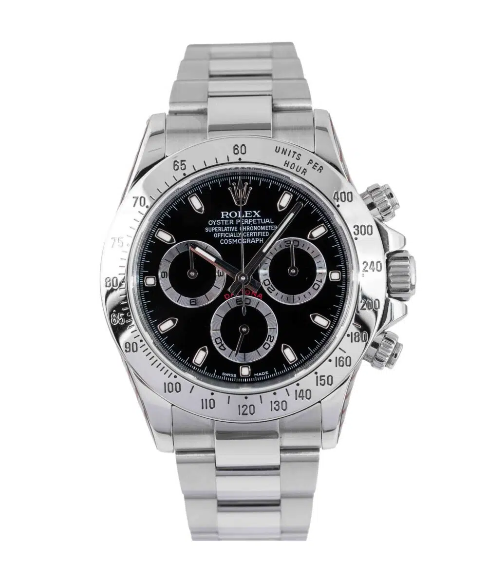 This Rolex Daytona 116520 has a Black dial and a Bracelet strap.