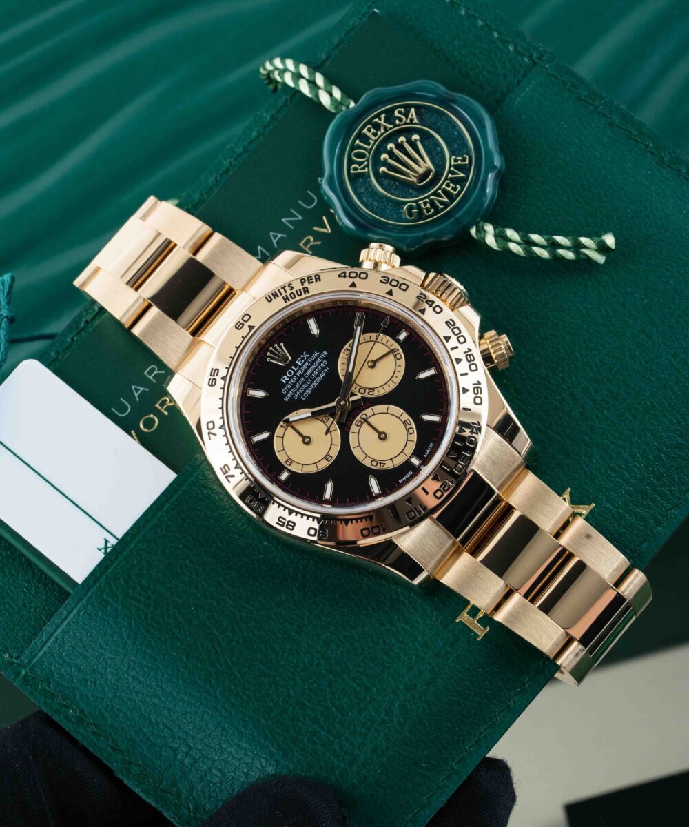 This Rolex Daytona 126508 has a Black dial and a Bracelet strap.