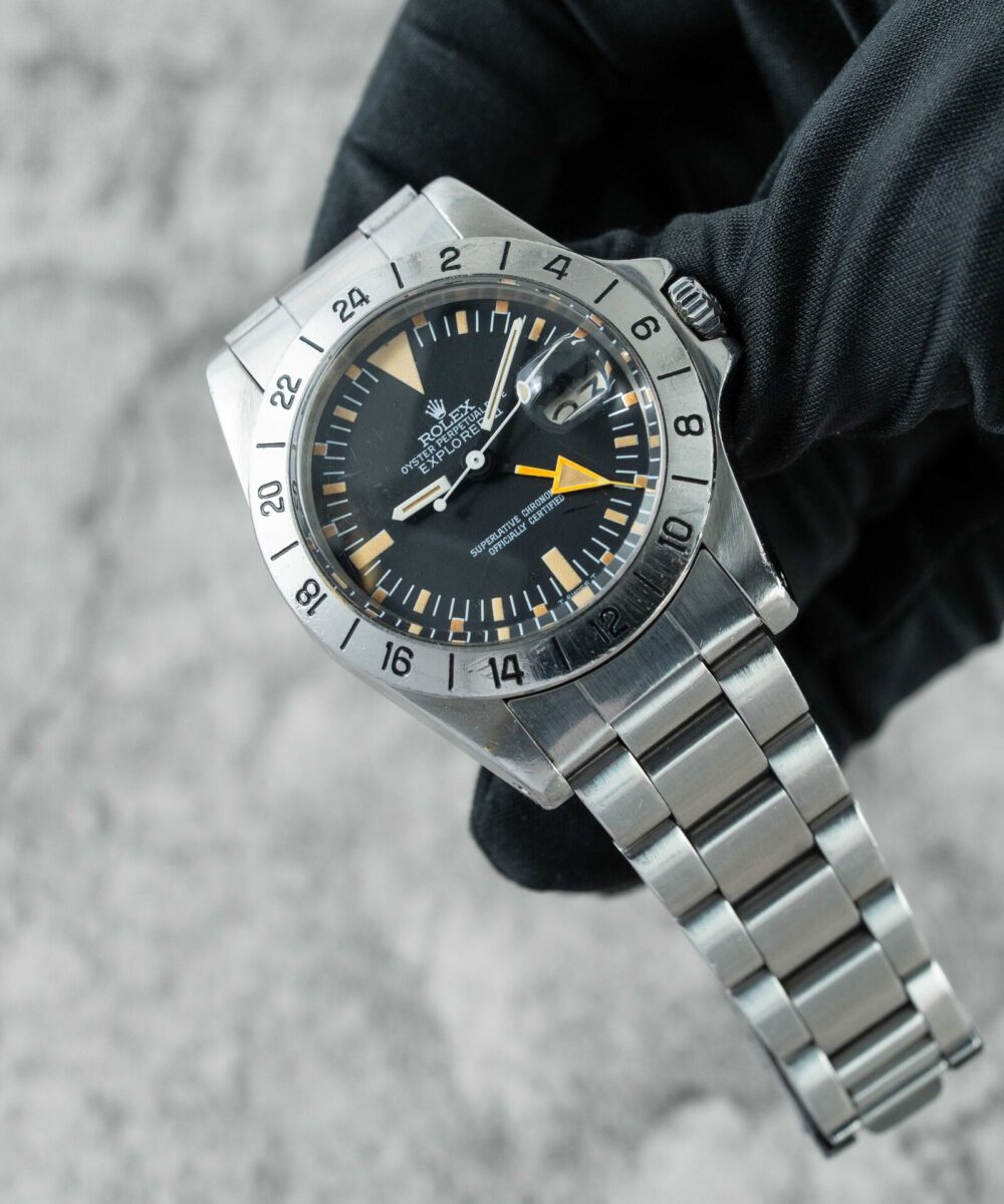 This Rolex Explorer II 1655 has a Black dial and a Bracelet strap.