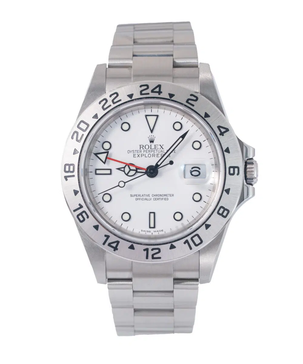 This Rolex Explorer II 16570 has a White dial and a Bracelet strap.