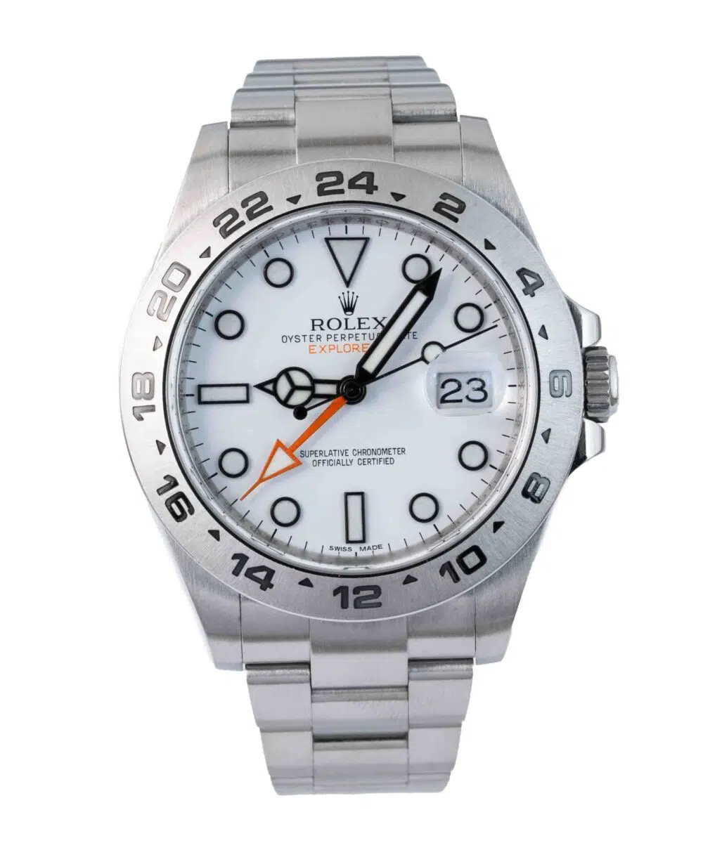 This Rolex Explorer II 216570 has a White dial and a Bracelet strap.