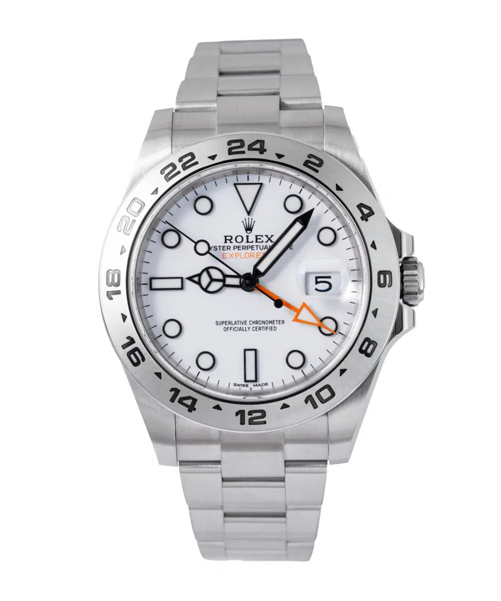 This Rolex Explorer II 216570 has a White dial and a Bracelet strap.