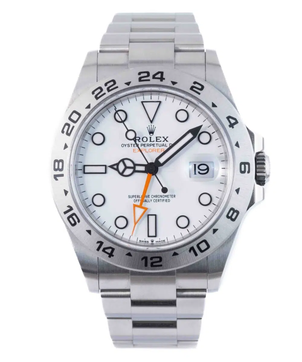 This Rolex Explorer II 226570 has a White dial and a Bracelet strap.