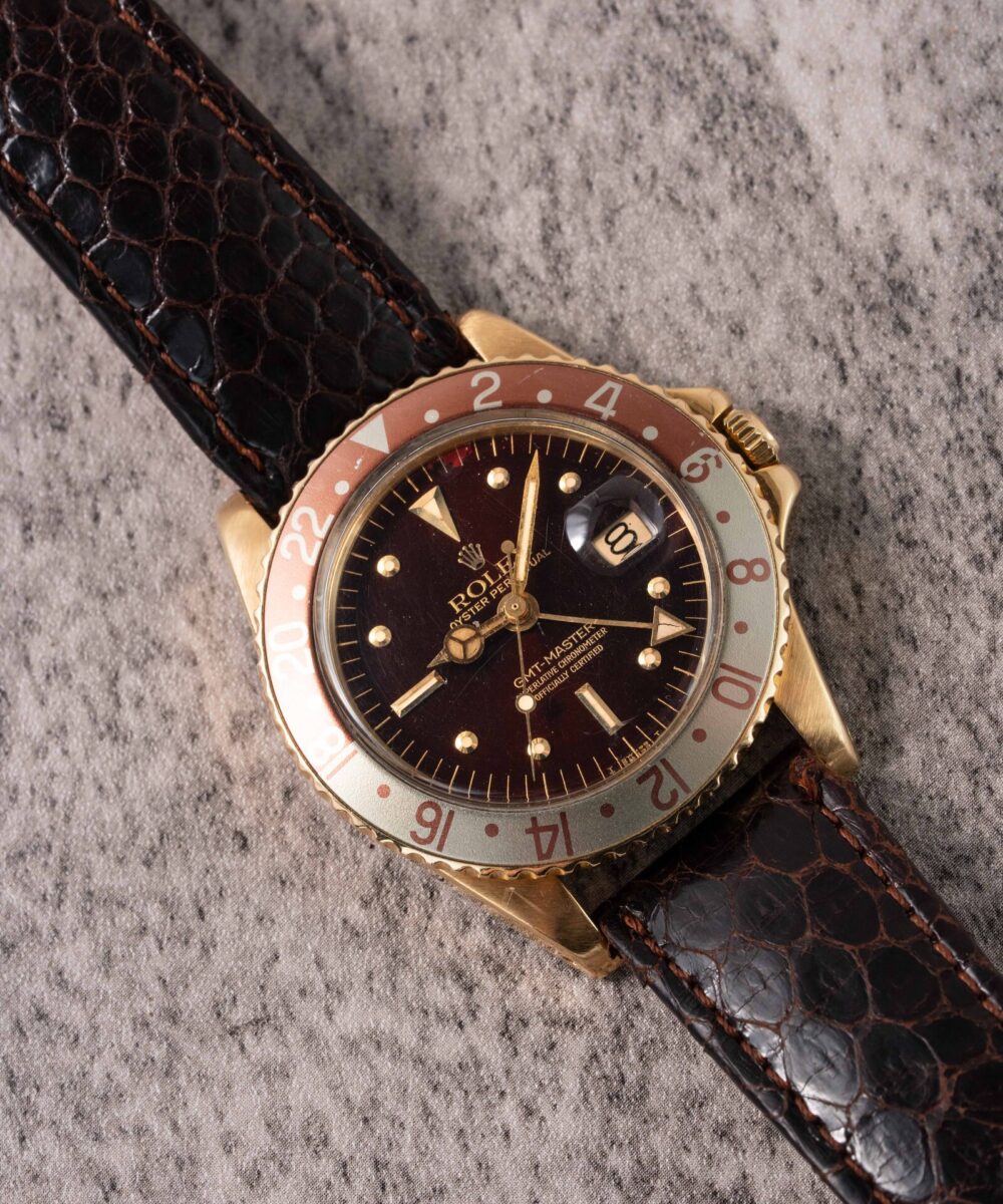 This Rolex GMT-Master 1675/8 has a Bronze dial and a Leather strap.