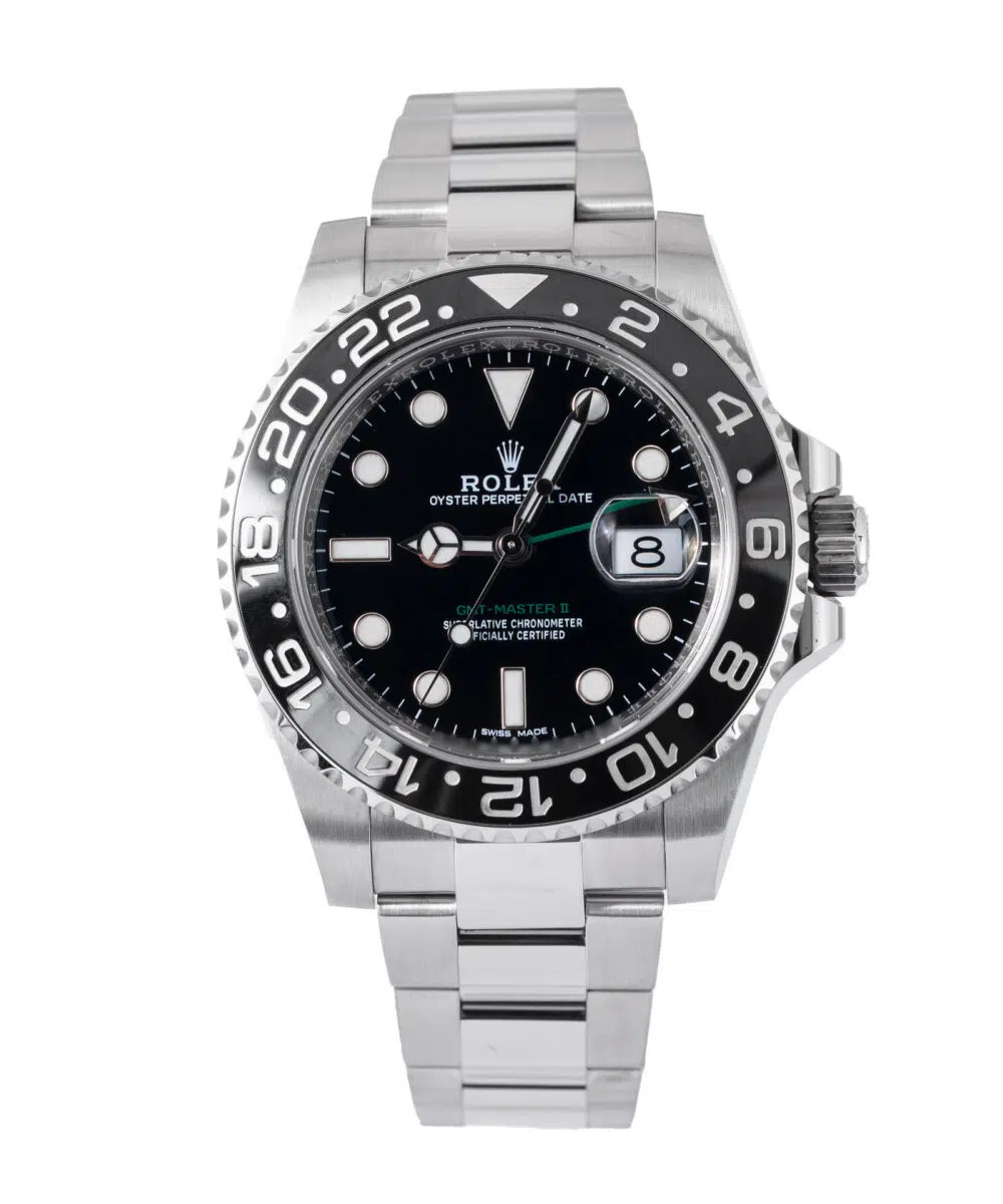 This Rolex GMT-Master II 116710LN has a Black dial and a Bracelet strap.