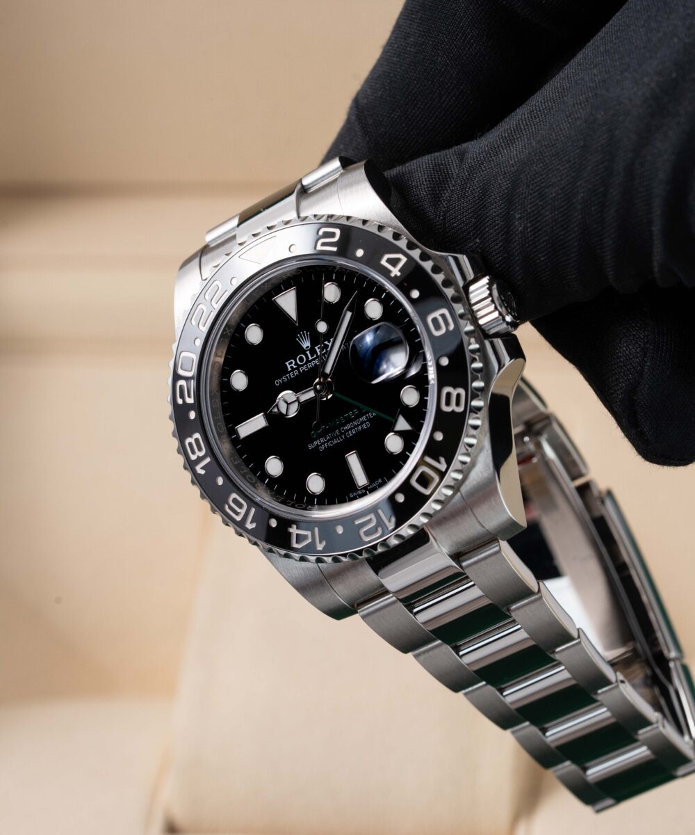 This Rolex GMT-Master II 116710LN has a Black dial and a Bracelet strap.