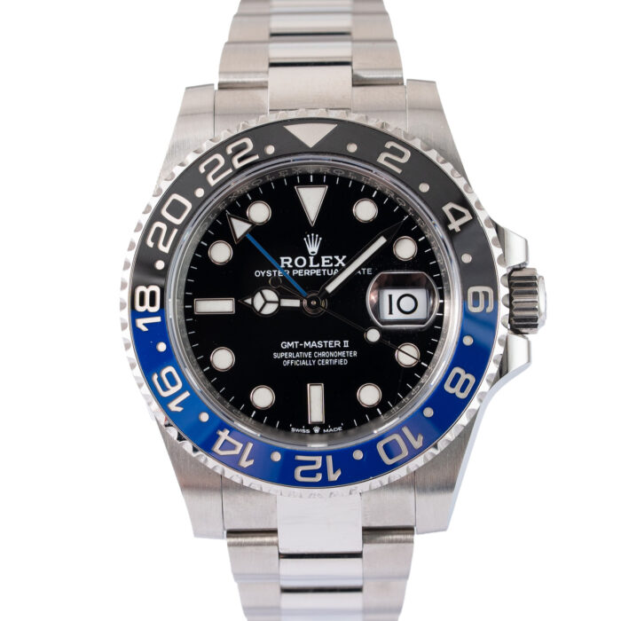 This Rolex GMT-Master II 126710BLNR has a Black dial and a Bracelet strap.