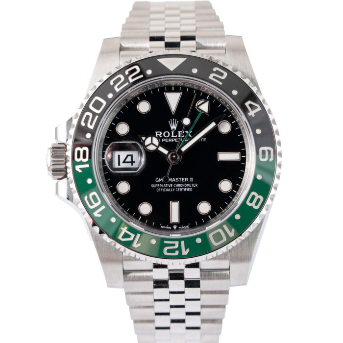 This Rolex GMT-Master II 126710BLNR has a Black dial and a Bracelet strap.
