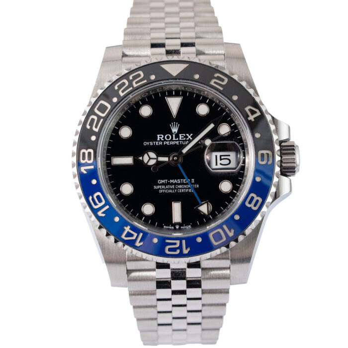 This Rolex GMT-Master II 126710BLNR has a Black dial and a Bracelet strap.