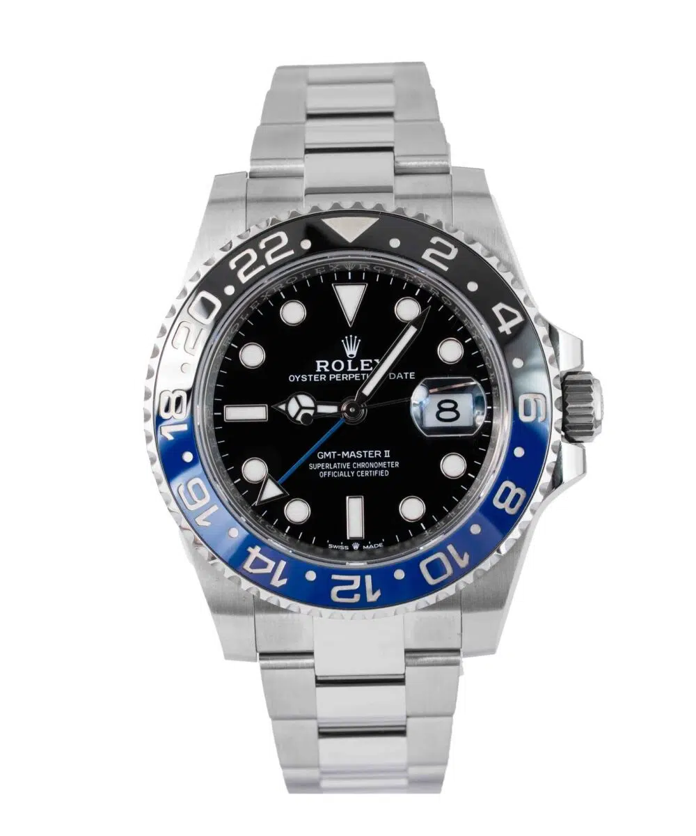 This Rolex GMT-Master II 126710BLNR has a Black dial and a Bracelet strap.
