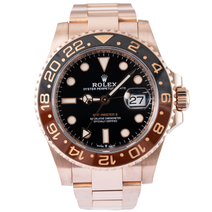 This Rolex GMT-Master II 126710BLNR has a Black dial and a Bracelet strap.