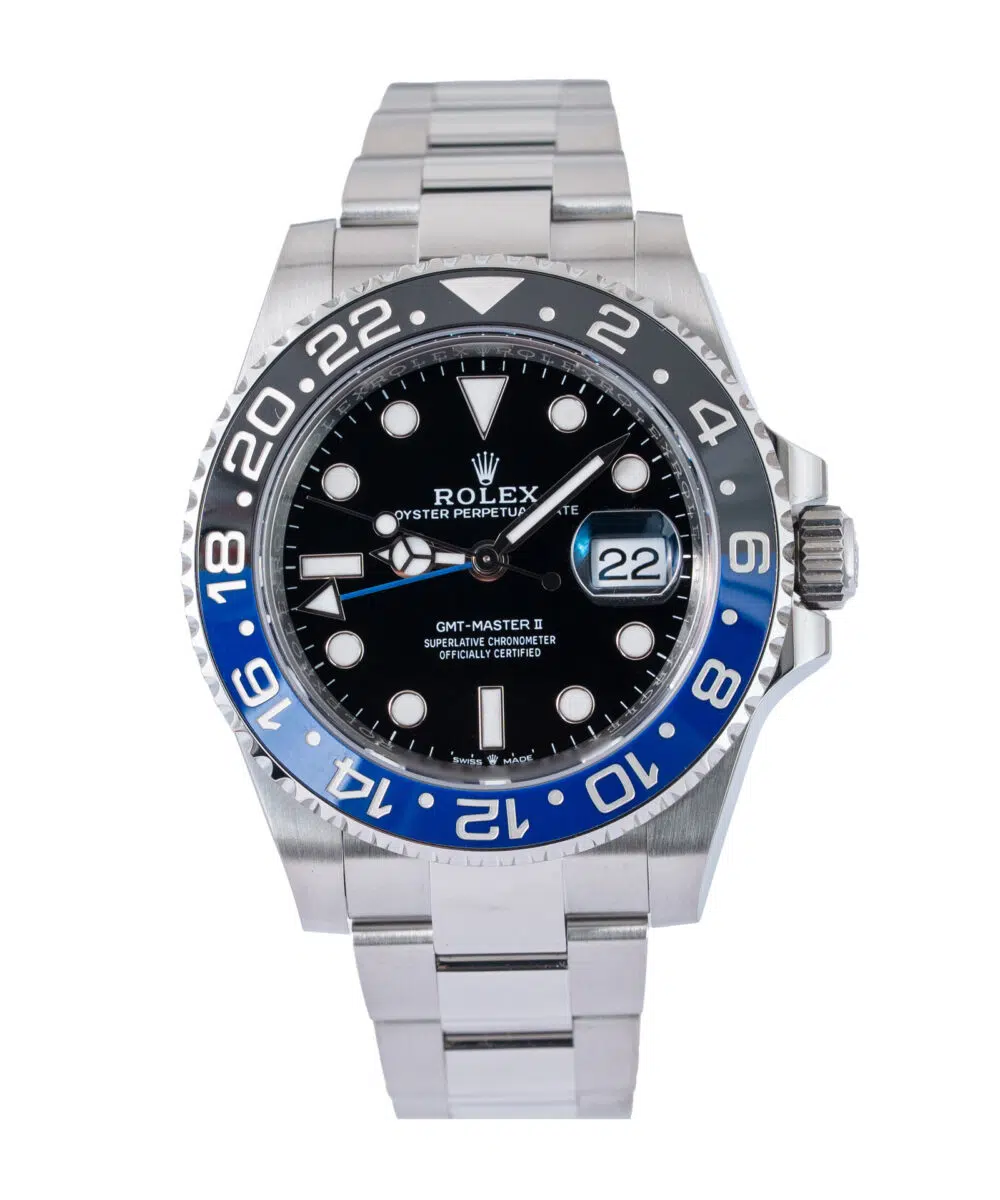 This Rolex GMT-Master II 126710BLNR has a Black dial and a Bracelet strap.