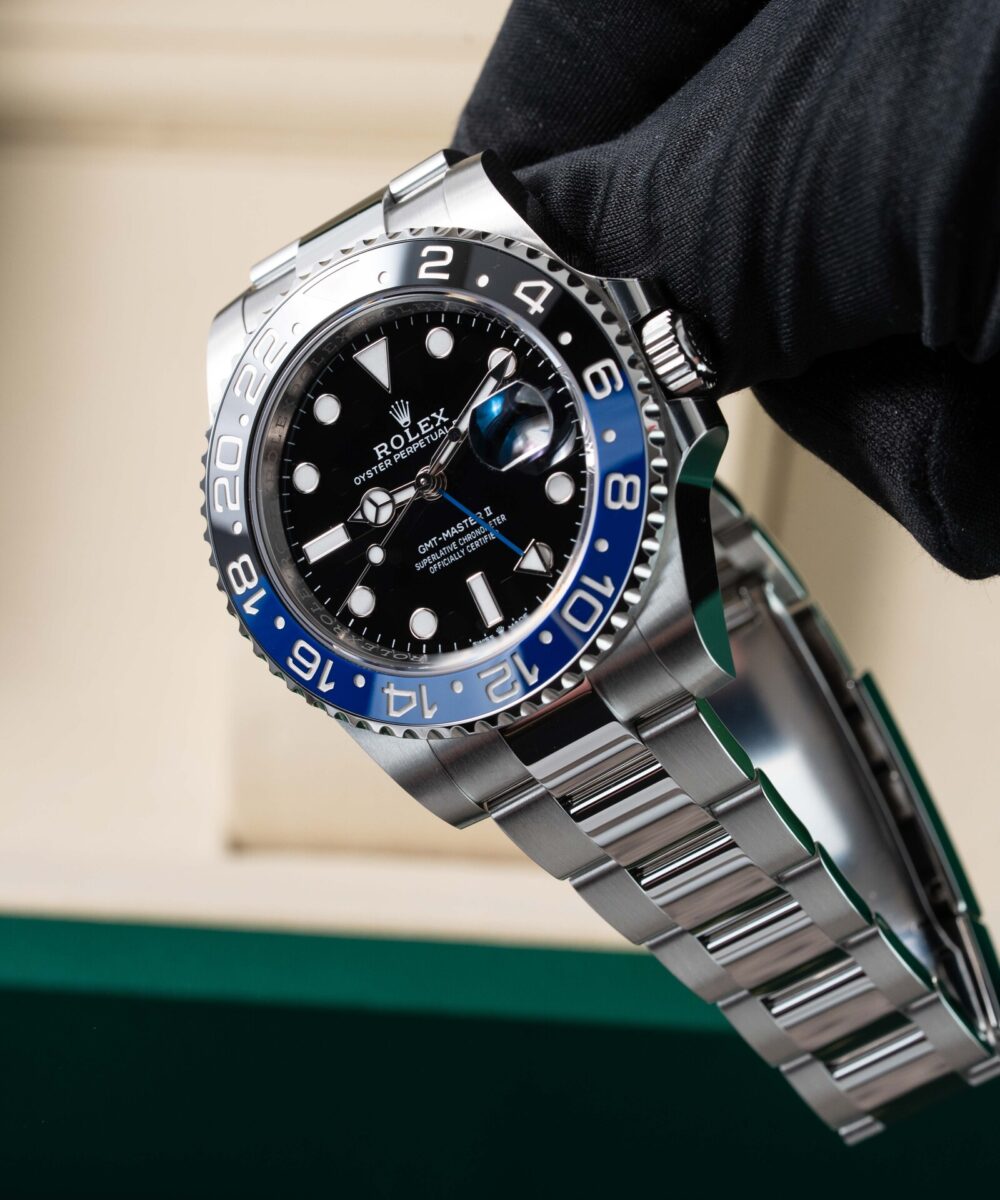 This Rolex GMT-Master II 126710BLNR has a Black dial and a Bracelet strap.