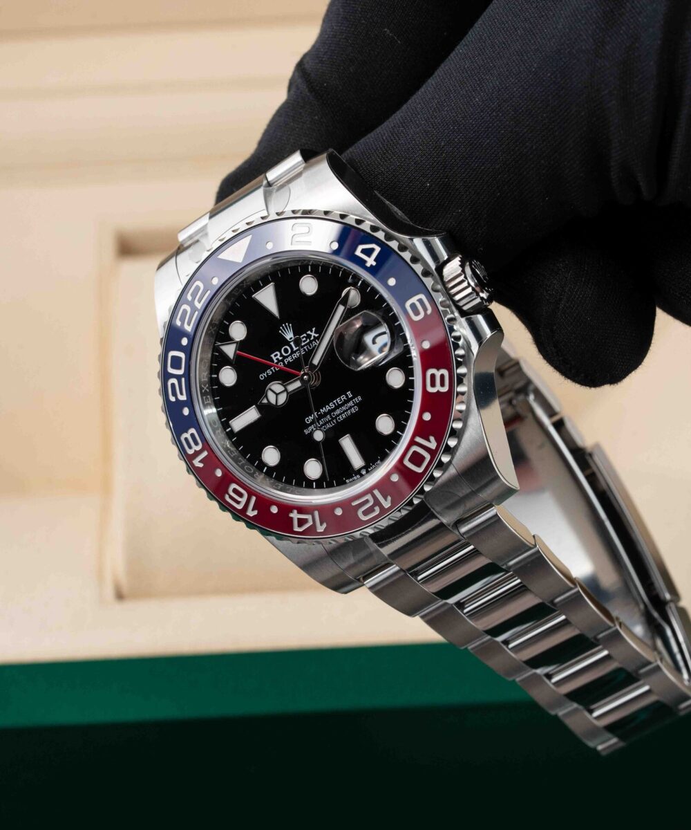 This Rolex GMT-Master II 126710BLRO has a Black dial and a Bracelet strap.