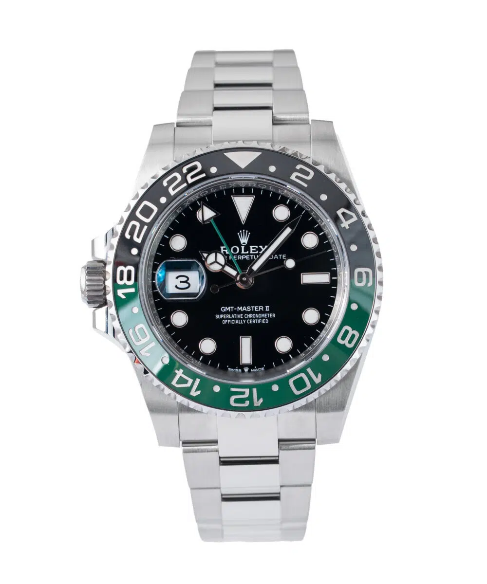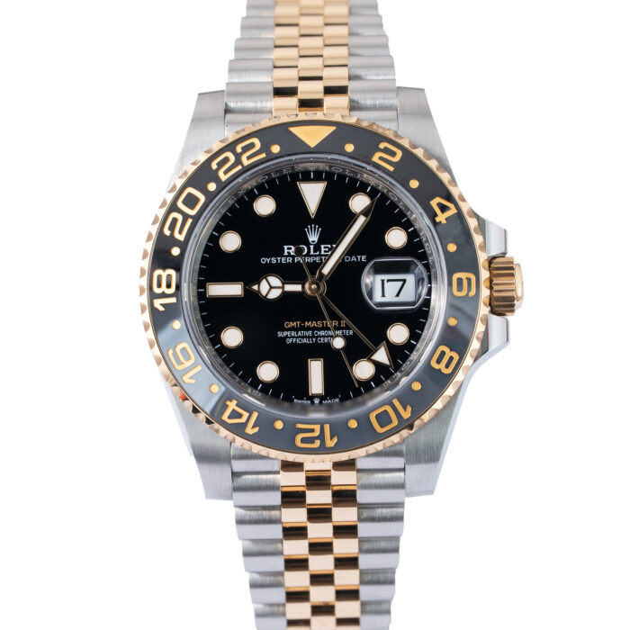 This Rolex GMT-Master II 126720VTNR has a Black dial and a Bracelet strap.