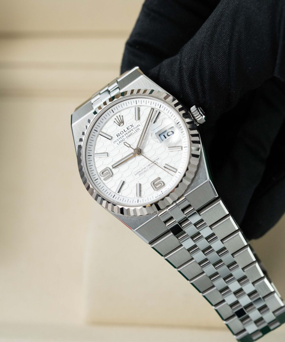 This Rolex Land-Dweller 127234 has a White dial and a Bracelet strap.
