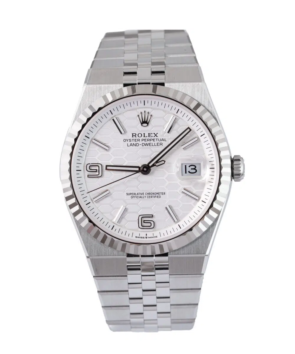 This Rolex Land-Dweller 127334 has a Silver dial and a Bracelet strap.
