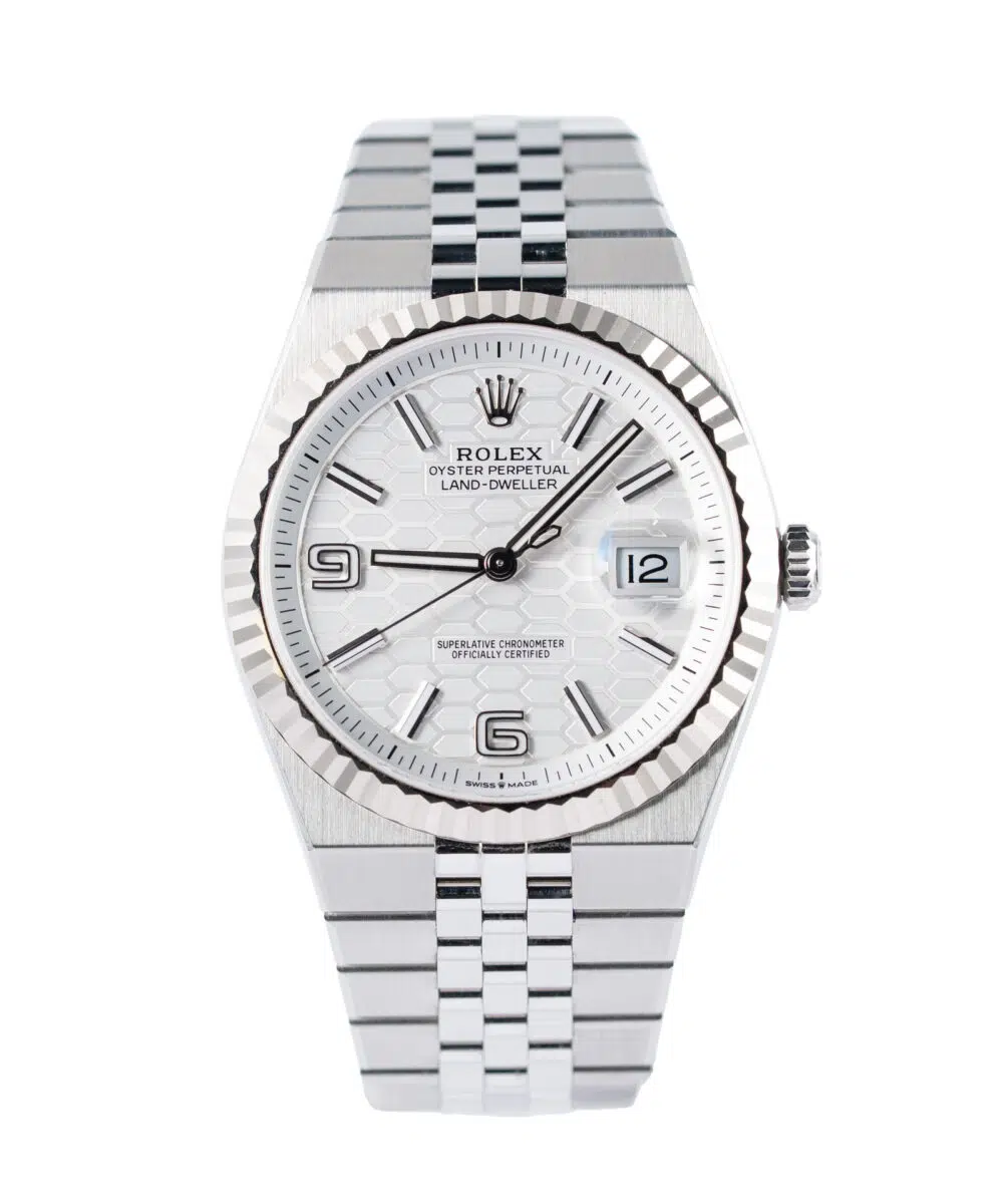 This Rolex Land-Dweller 127334 has a White dial and a Bracelet strap.