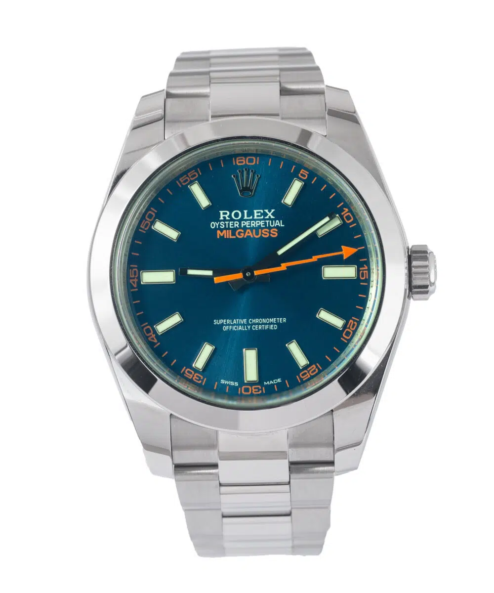 This Rolex Milgauss 116400GV has a Blue dial and a Bracelet strap.