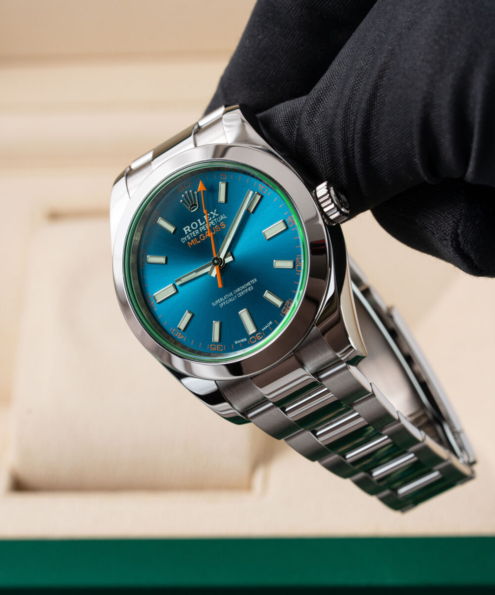This Rolex Milgauss 116400GV has a Blue dial and a Bracelet strap.