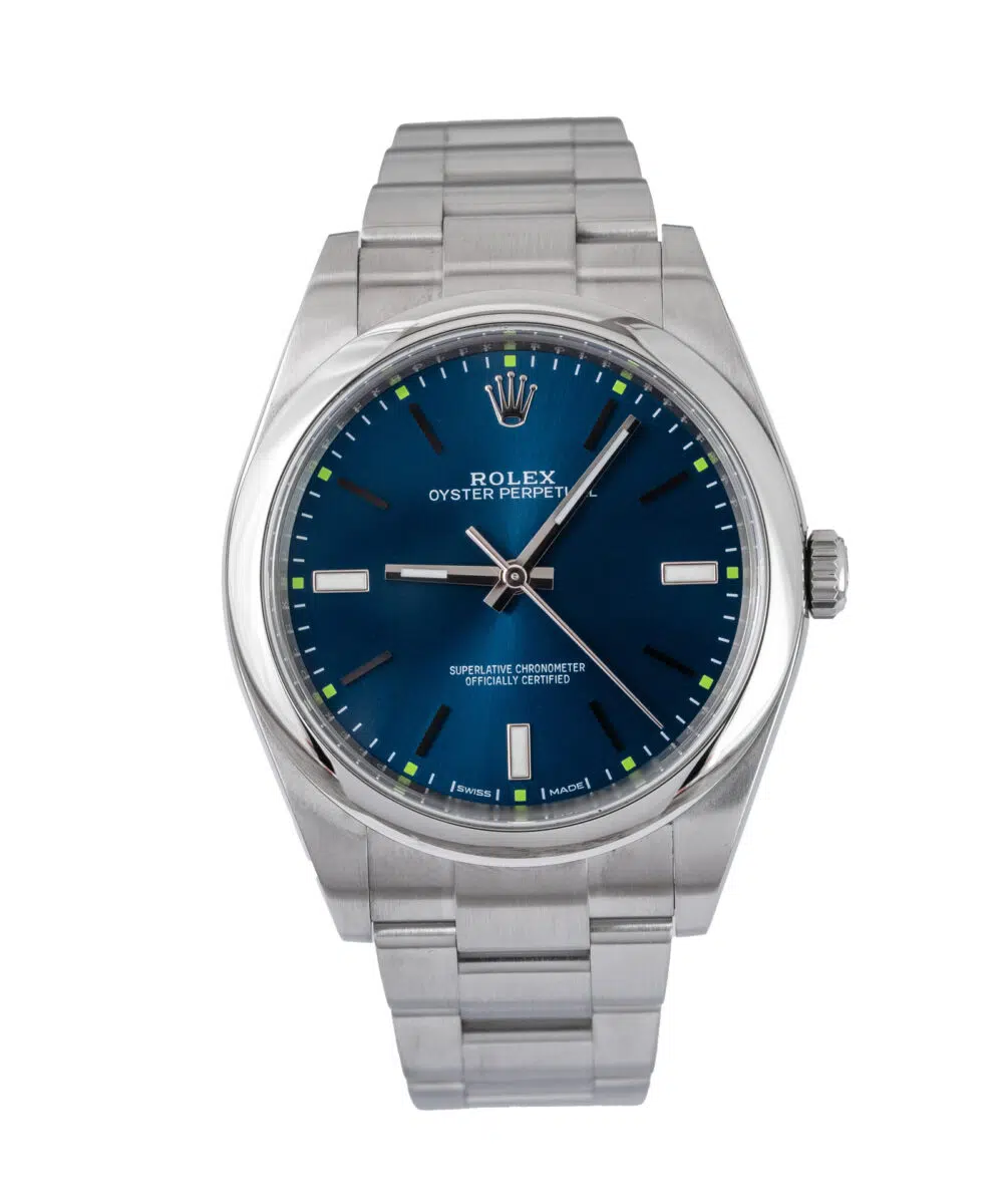 This Rolex Oyster Perpetual 114300 has a Blue dial and a Bracelet strap.