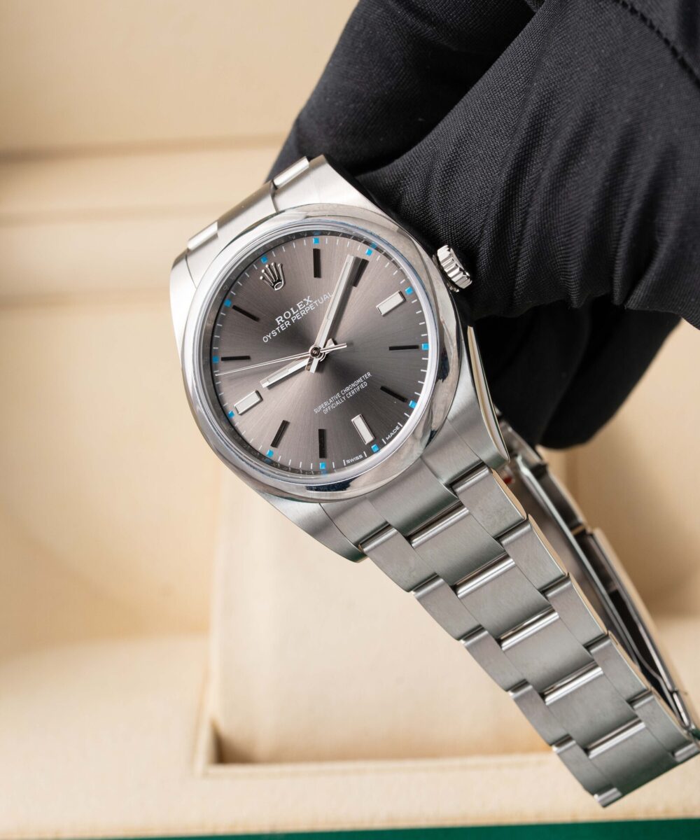 This Rolex Oyster Perpetual 114300 has a Grey dial and a Bracelet strap.