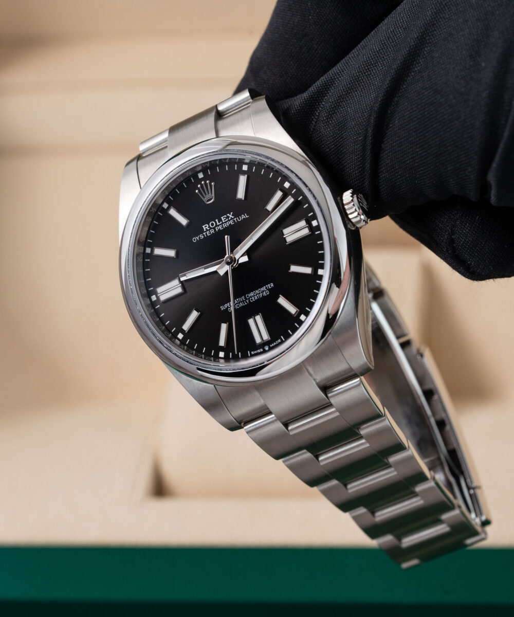 This Rolex Oyster Perpetual 124300 has a Black dial and a Bracelet strap.