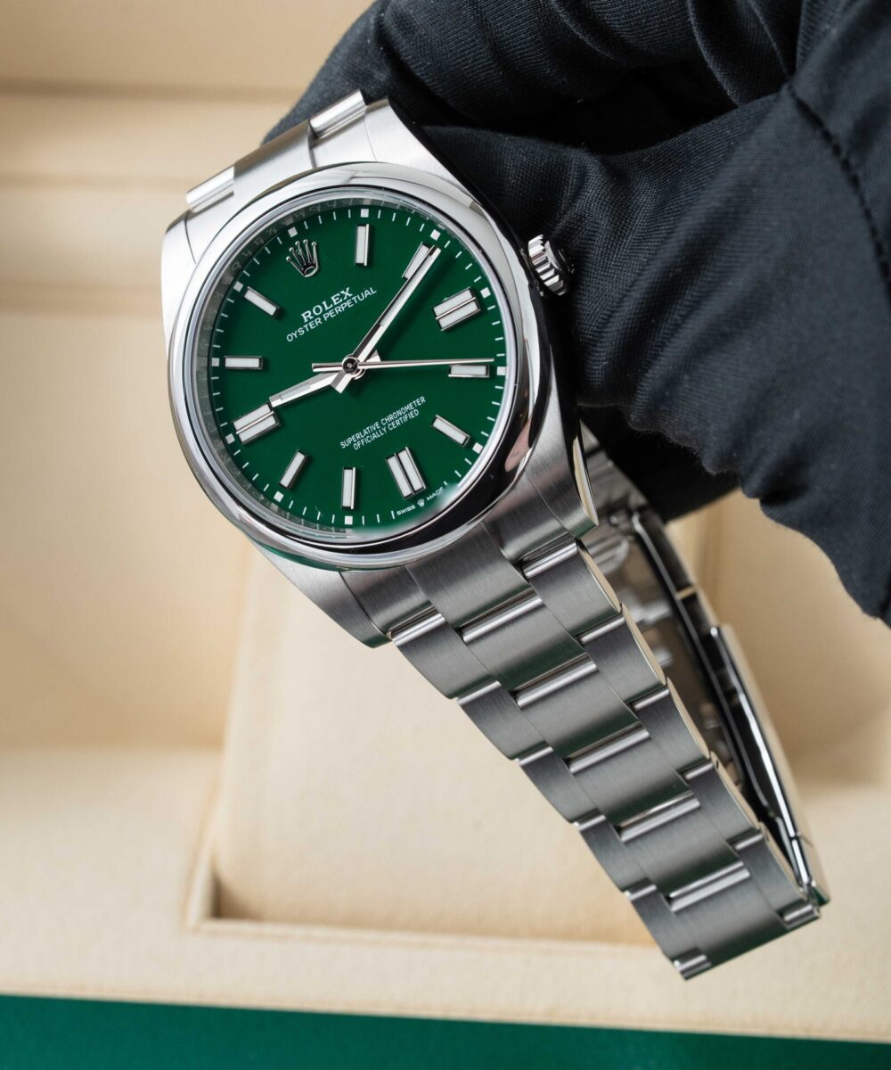 This Rolex Oyster Perpetual 124300 has a Green dial and a Bracelet strap.