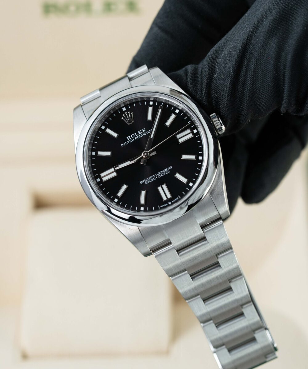 This Rolex Oyster Perpetual 124300 has a Black dial and a Bracelet strap.