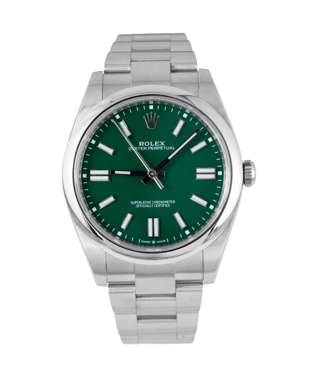 This Rolex Oyster Perpetual 124300 has a Green dial and a Bracelet strap.