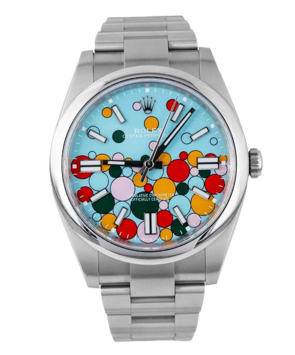 This Rolex Oyster Perpetual 124300 has a Blue dial and a Bracelet strap.
