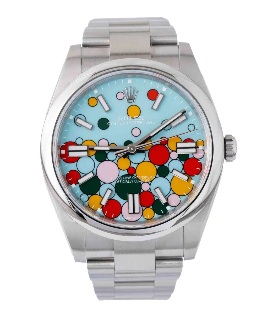 This Rolex Oyster Perpetual 124300 has a Blue dial and a Bracelet strap.