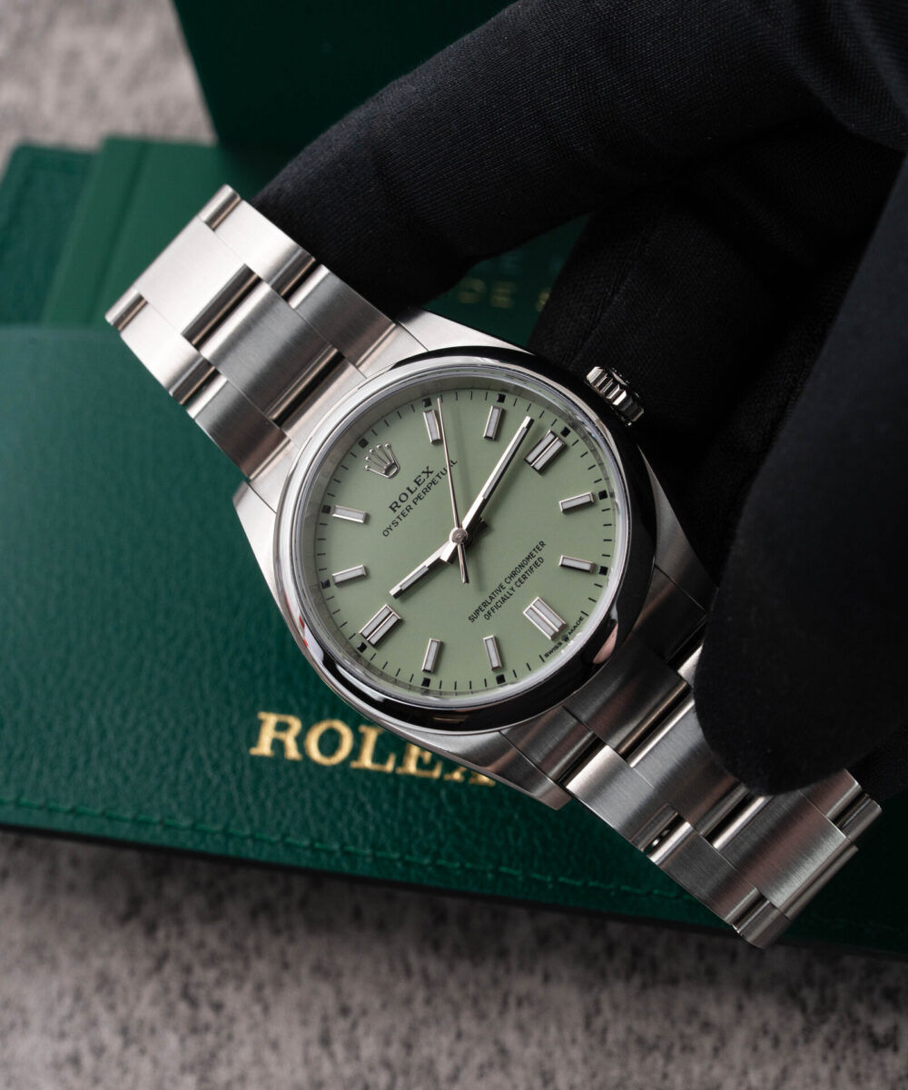 This Rolex Oyster Perpetual 126000 has a Green dial and a Bracelet strap.