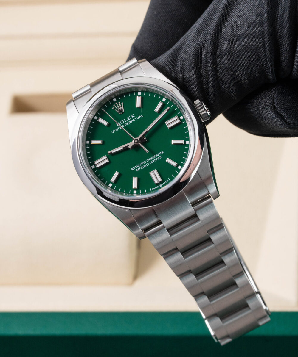 This Rolex Oyster Perpetual 126000 has a Green dial and a Bracelet strap.