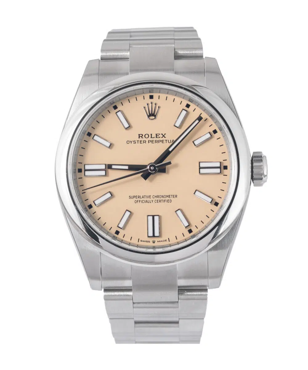This Rolex Oyster Perpetual 134300 has a Beige dial and a Bracelet strap.